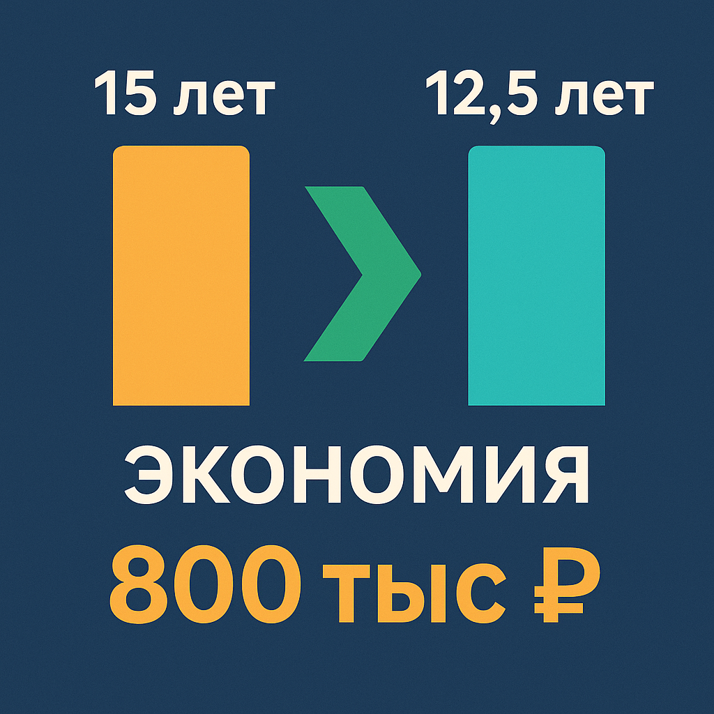 - Рефинансирование при снижении ставок на ≥ 1,5–2 п.п. — минус 3–7 лет и сотни тысяч процентов.